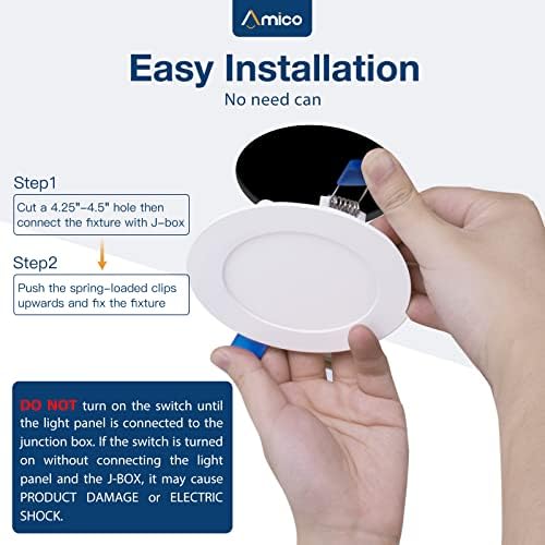 IC Rated: Amico’s canless LED recessed light is IC rated, which is permitted to be in contact with insulations in ceilings, meaning the junction box is thermally protected. It only requires as small as 2 inches ceiling spaces, fits various ceilings, and joists. It won’t cause a fire in the roof or overhead joist space.